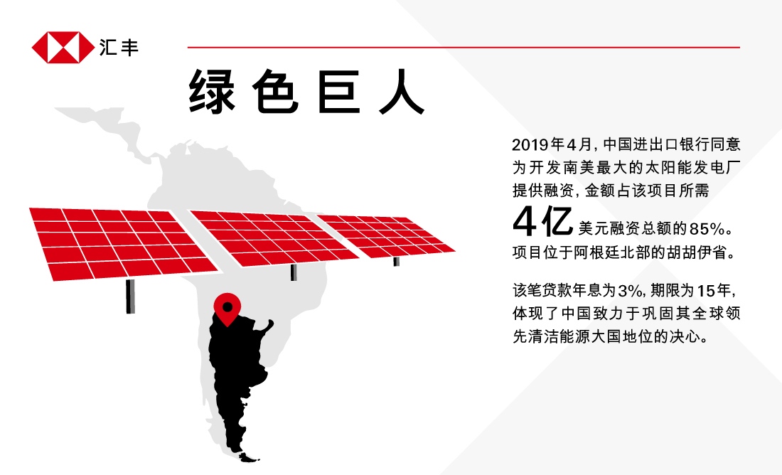 2019年1月,全球能源转变地缘政治委员会发布的一份报告指出:“没有哪个国家比中国更具备成为世界可再生能源超级大国的条件。” 4 三个月过后,中国进出口银行同意为开发南美最大的太阳能发电场提供融资,金额占该项目所需4亿美元融资总额的85%。5 融资的前提条件为项目建设所需的材料将主要从中资供应商手里采购。这一融资项目也表明中国力图通过绿色能源来实现多元经济发展。随着中国不断努力实现到2030年将绿色能源依赖比例提高到35%的新目标,这一趋势将日益加速。6